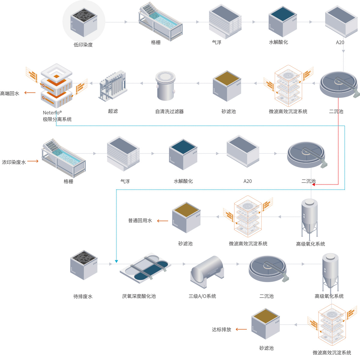 工艺制定原则:印染废水达标排放的难点在于COD、NH3-N、TN、TP、色度的去除,废水处理过程中应尽量强化生化处理,并尽量减少物化的加药量,避免加入过多的无机盐,避免产生大量的污泥。
