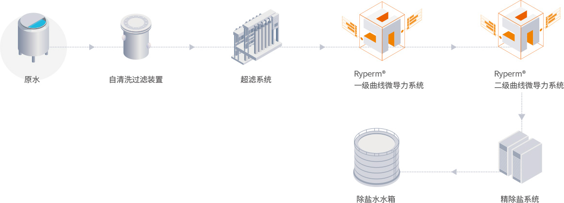 莱特莱德锅炉补给水工艺采用自主研发的Ryperm曲线微导力技术,结合多项涵盖预处理、化学清洗、加药等专利工艺技术,成功解决膜系统在高回收率条件下的污染问题,保证了膜系统的稳定性,从而使该项膜技术的经典应用再度焕发光芒。