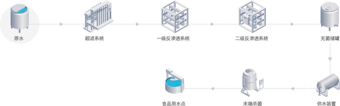 市政自来水已经不能满足食品、饮料、乳制品等行业用水的要求。中国正在食品饮料行业实施食品生产许可证制度(SC),规定中要求工艺水及成品水均需要用净化后的水。