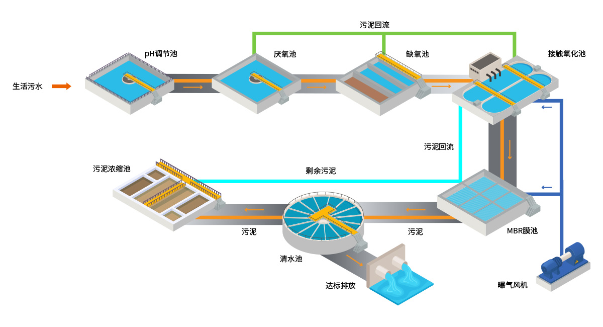 通过曝气风机向污水中充氧,给好氧微生物补充氧气,从而分解水中的污染物;同时在MBR膜运行产水过程中进行曝气,以达到更佳的运行效果。